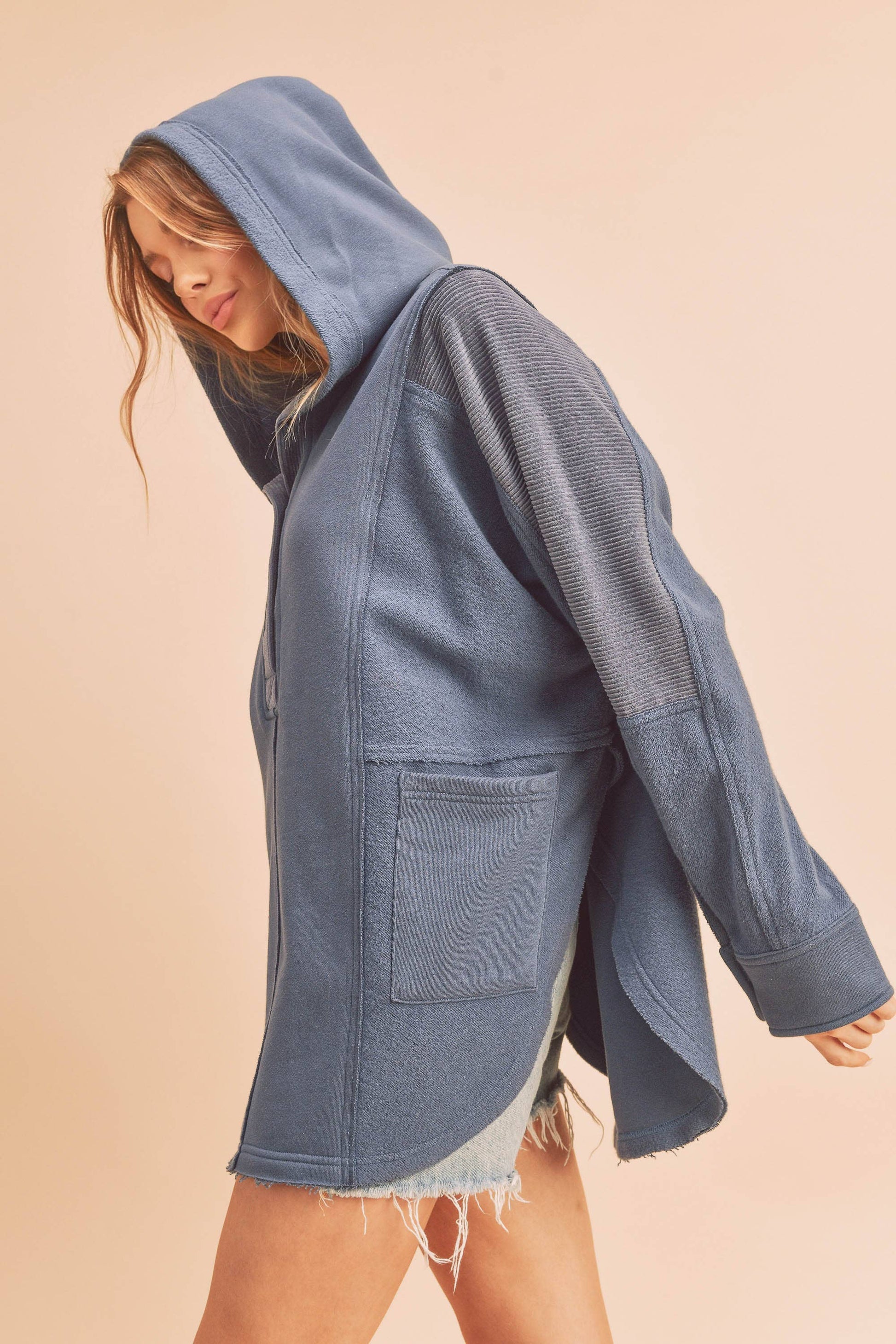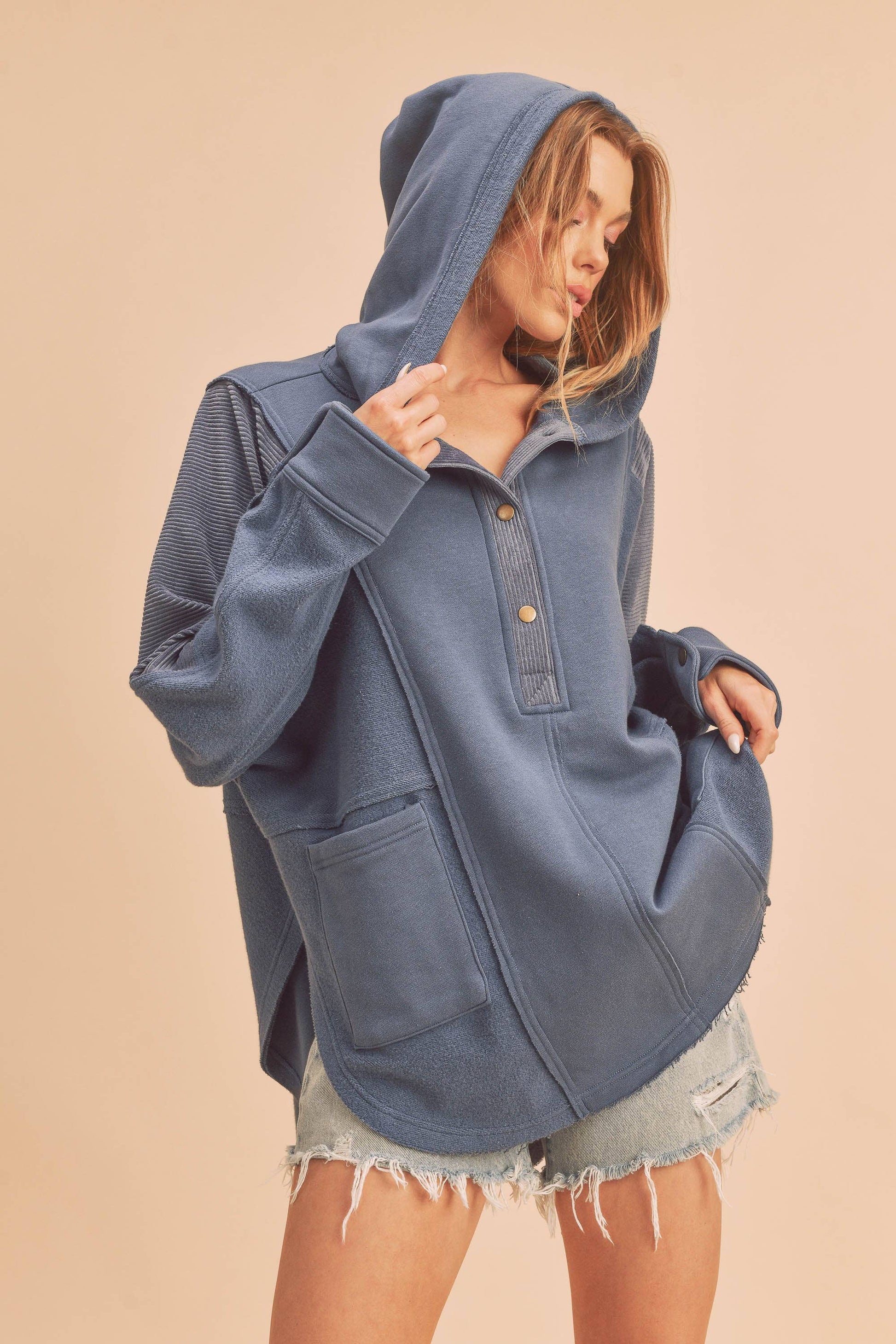 Our favorite mixed media Dove Pullover features an oversized henley fit, contrasting corduroy panels with raw seaming throughout. She is perfect for layering up or down. Great for Beach Days, early morning, or evening walks.
