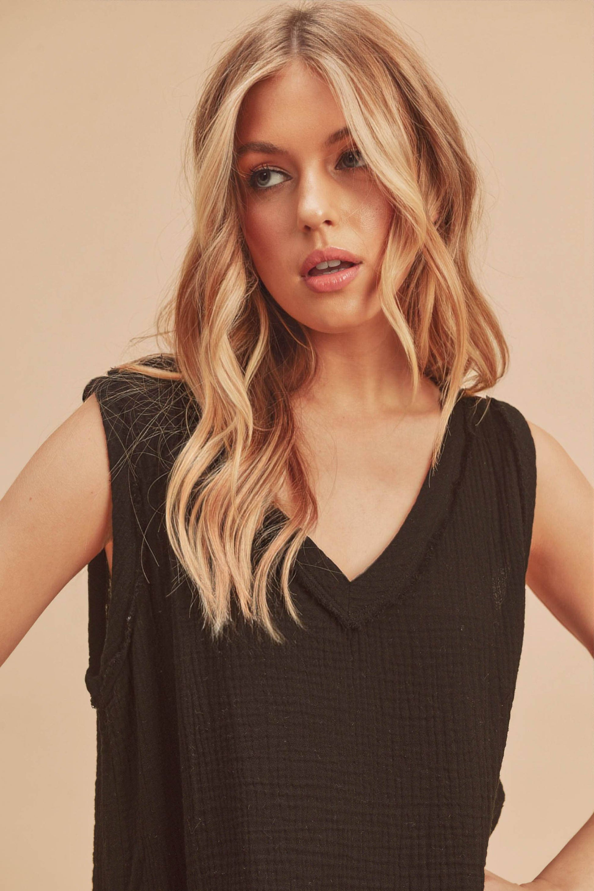 This Black Nasia Tank is your new go-to for effortless style and comfort. Made from your favorite soft cotton gauze, it feels light and breezy all day long. The playful v-neckline adds a flirty touch, while the raw edge detail keeps things cool and casual. Perfect for layering or wearing solo, this tank brings easy charm to any outfit. detailing throughout for cooler days and nights.