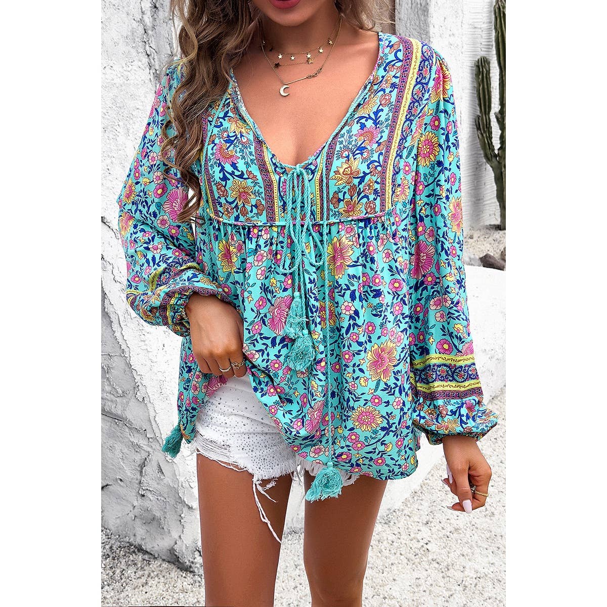 Embrace your free spirit with our All Over Floral Print Boho Top! This playful piece features a flirty deep V neckline with cross detailing that adds just the right touch of romance. Perfect for festival season or casual brunches, this top brings bohemian vibes to any outfit. Pair with your favorite denim for an effortlessly chic look!