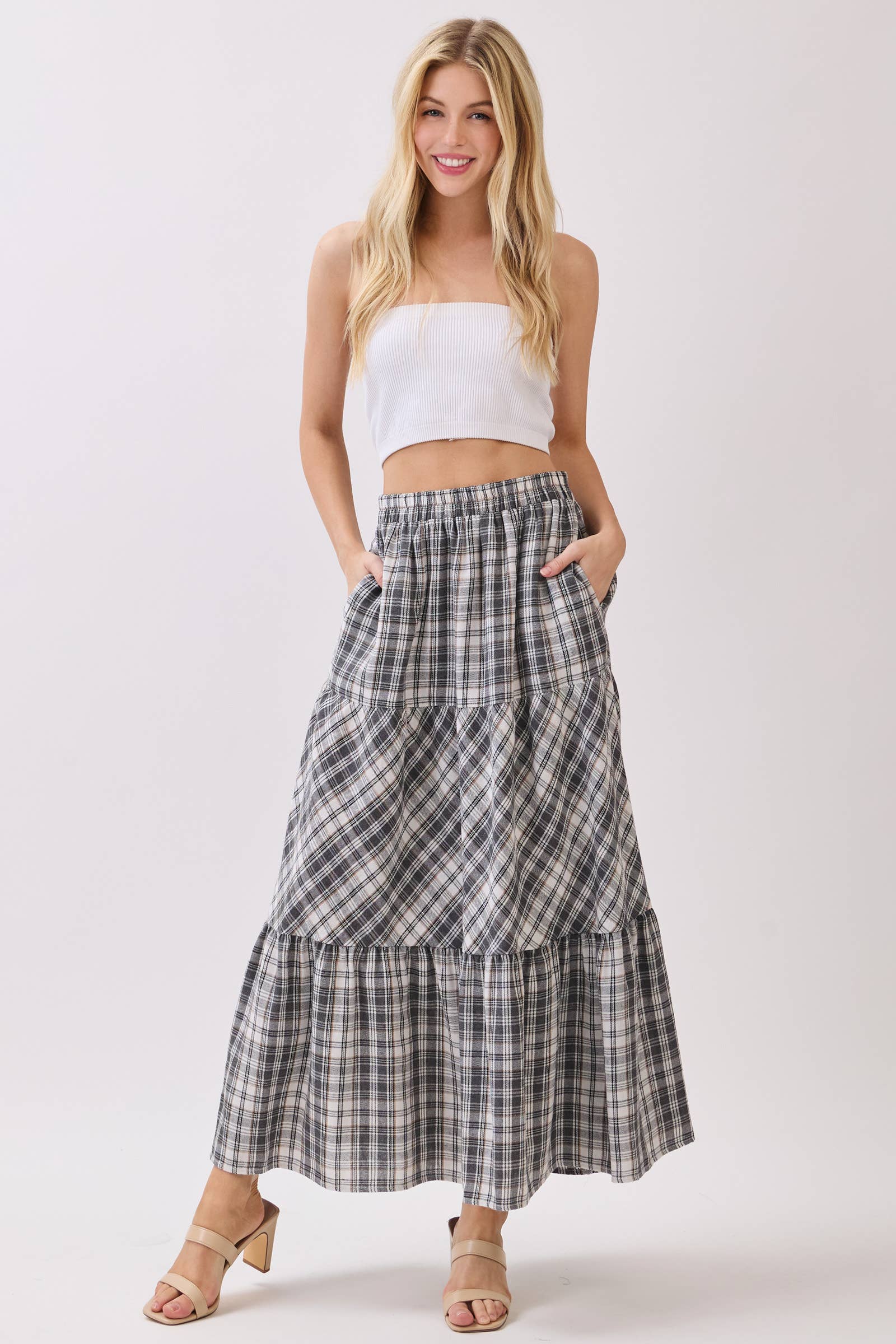 Add a dash of fun to your wardrobe with the BOHO Check Midi Skirt in charcoal! Its playful tiered layers, pockets, and cozy plaid pattern bring a lively twist to any outfit. Perfect for twirling through your day with style and comfort, this skirt is your new go-to for a cheerful, casual look.