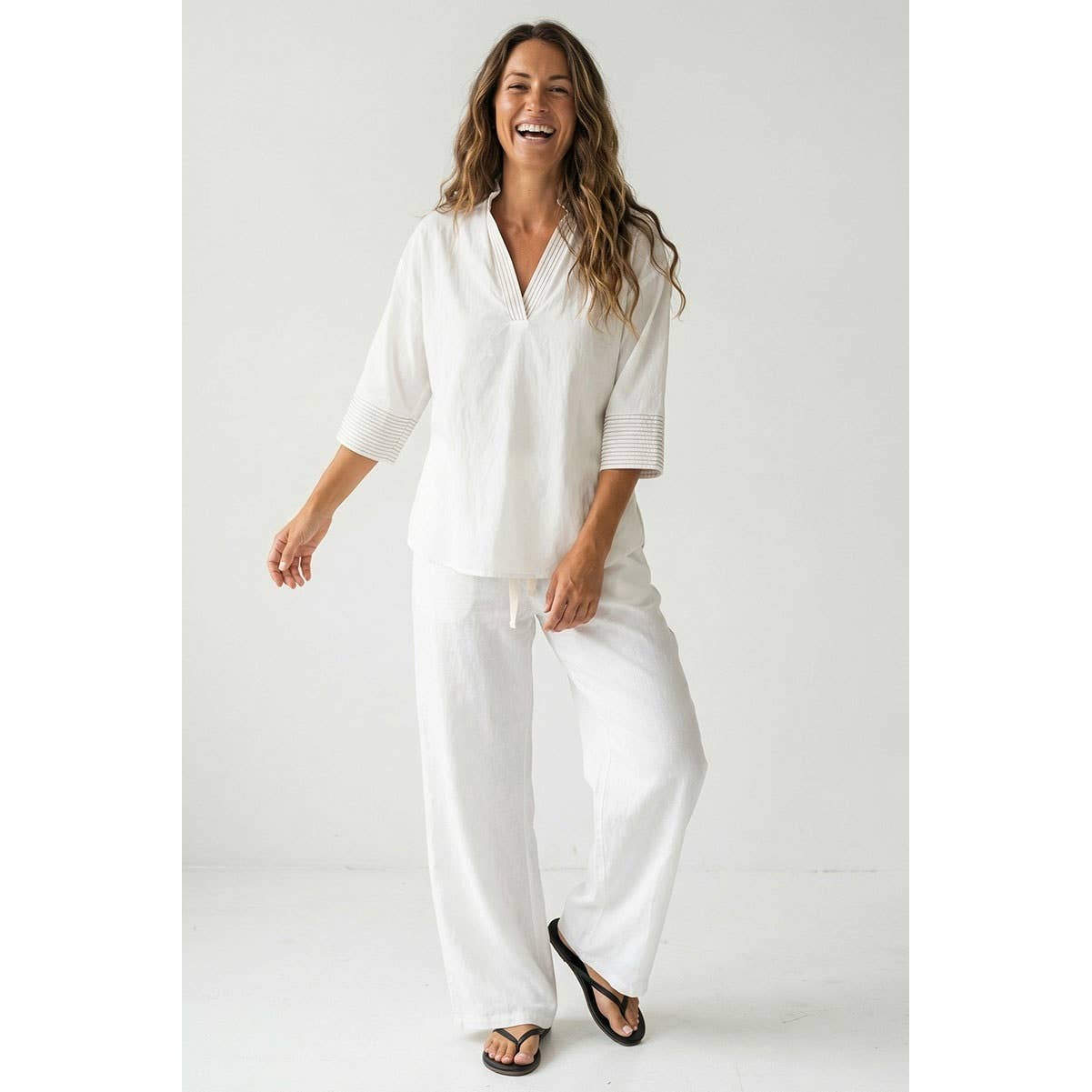 Cream tunic top, designed for effortless style and comfort. The flattering V-neckline and detailed beige stitching along the sleeves add a refined touch that works beautifully layered or worn solo. Perfect for casual outings or relaxed workdays, this versatile piece pairs seamlessly with your favorite jeans, leggings, or skirts. The relaxed tunic silhouette offers gentle coverage while maintaining a polished, put-together look.