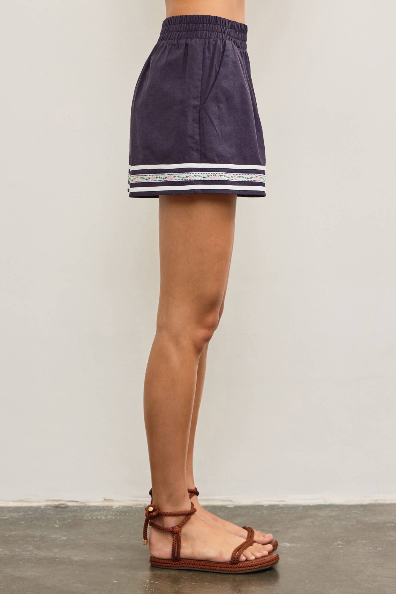 Women's indigo Cotton twill shorts designed for all-day comfort with an elastic waistband that moves with you. The hem features a delicate flower detail paired with a crisp white stripe, adding a playful touch to a versatile wardrobe staple. Perfect for casual outings, weekend wear, or layering into your favorite looks.