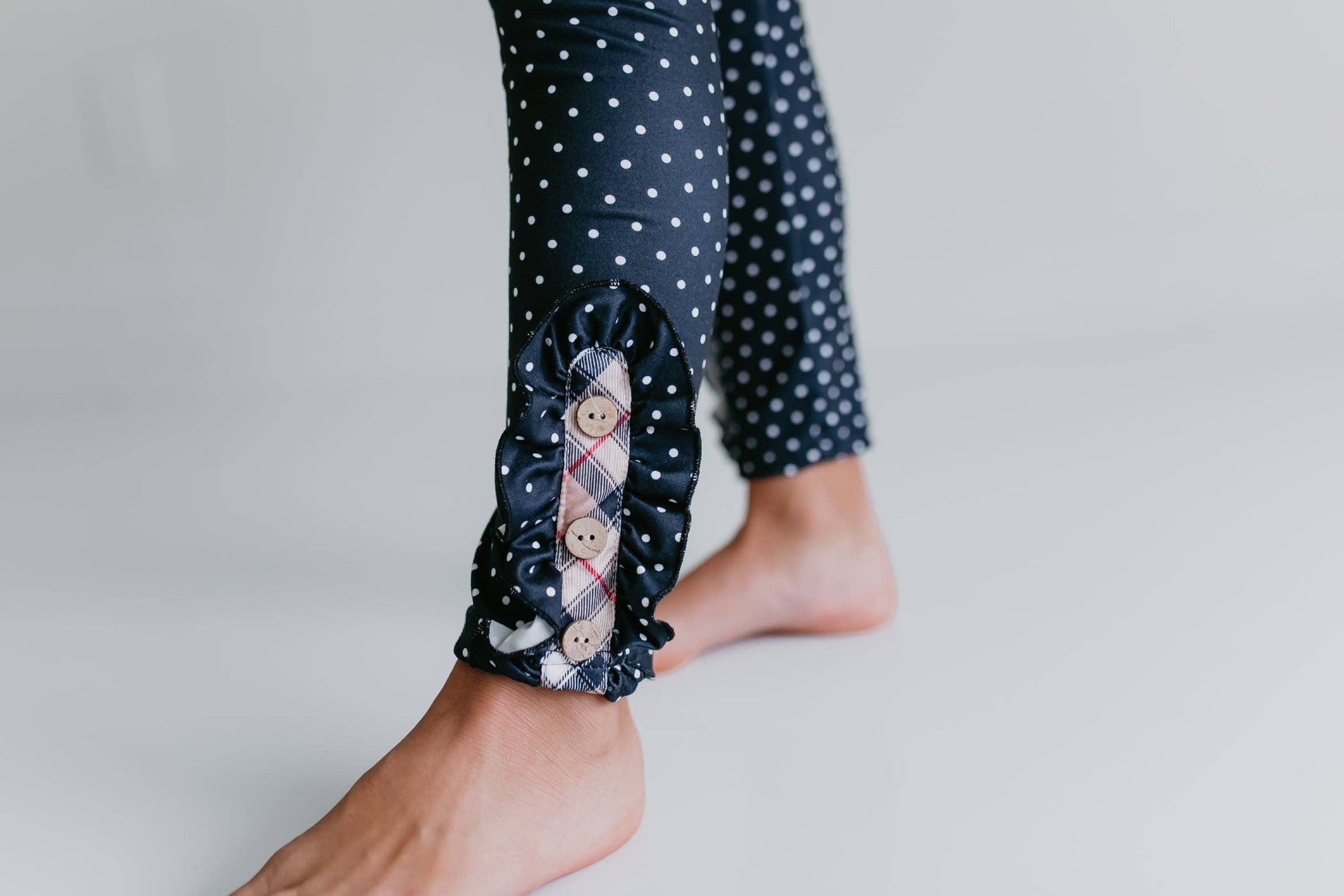 Get ready for some serious style with this Tan Plaid Button Set! Perfect for the fashion-forward girl, this set includes a trendy tan plaid shirt and matching buttons. Polka dot leggings with ruffle button accents. Perfect for back to school in the fall and winter.