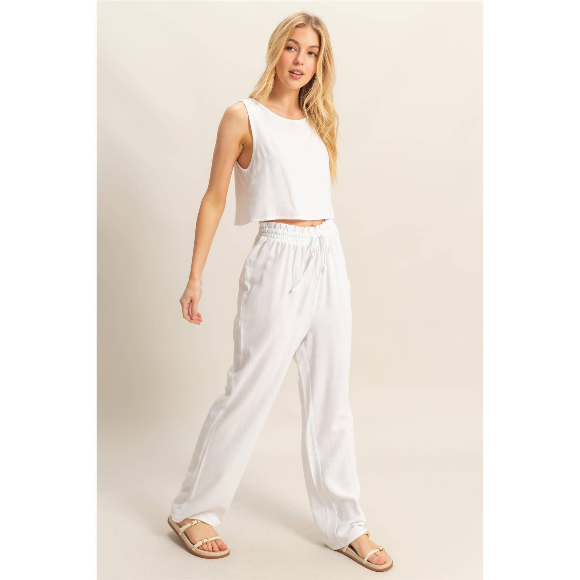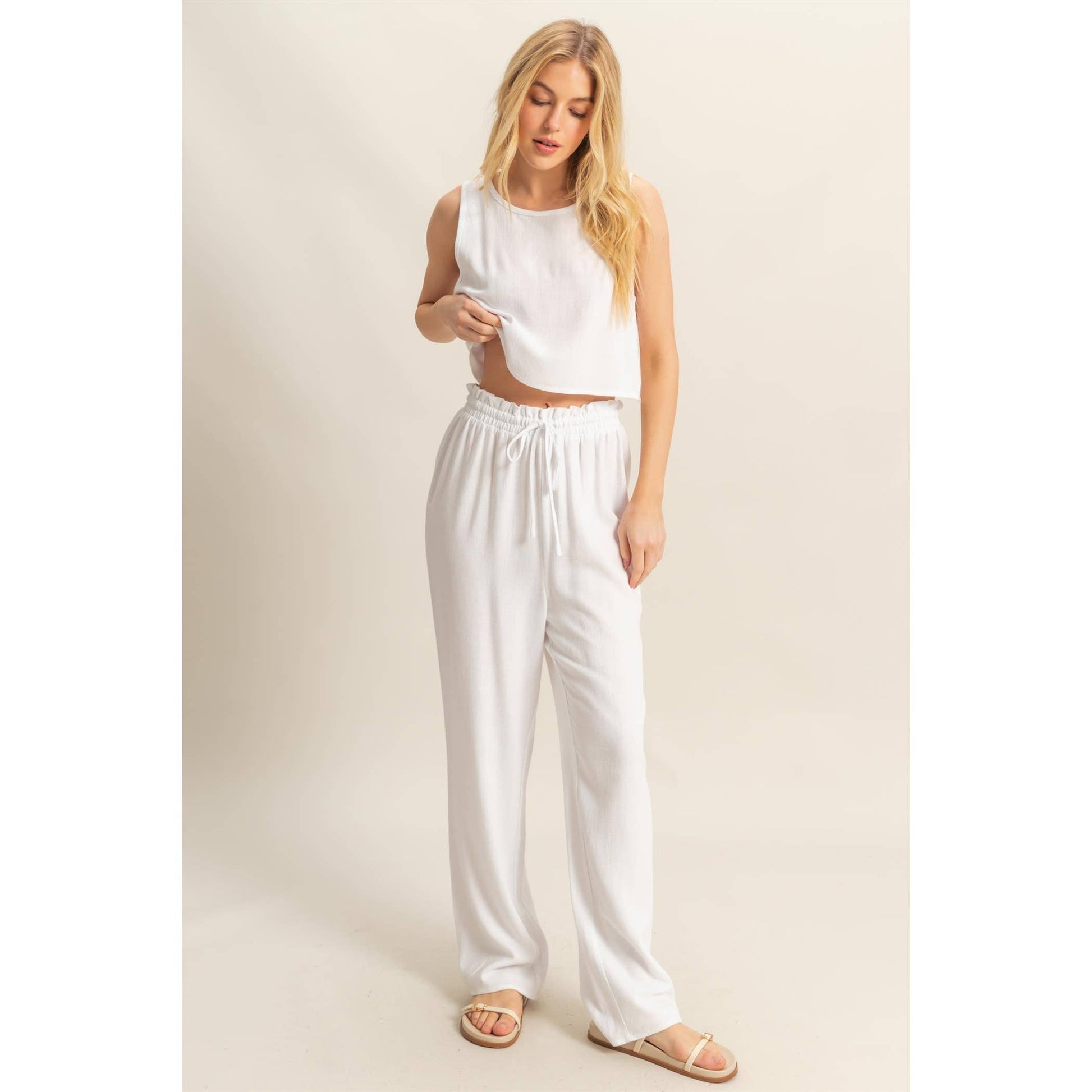 This off-white cropped tank top and relaxed-fit pants set combines comfort with casual style. Perfect for lounging or casual outings, the breathable fabric and easy fit keep you feeling free and playful all day long. Mix and match or wear together for an effortlessly chic look.