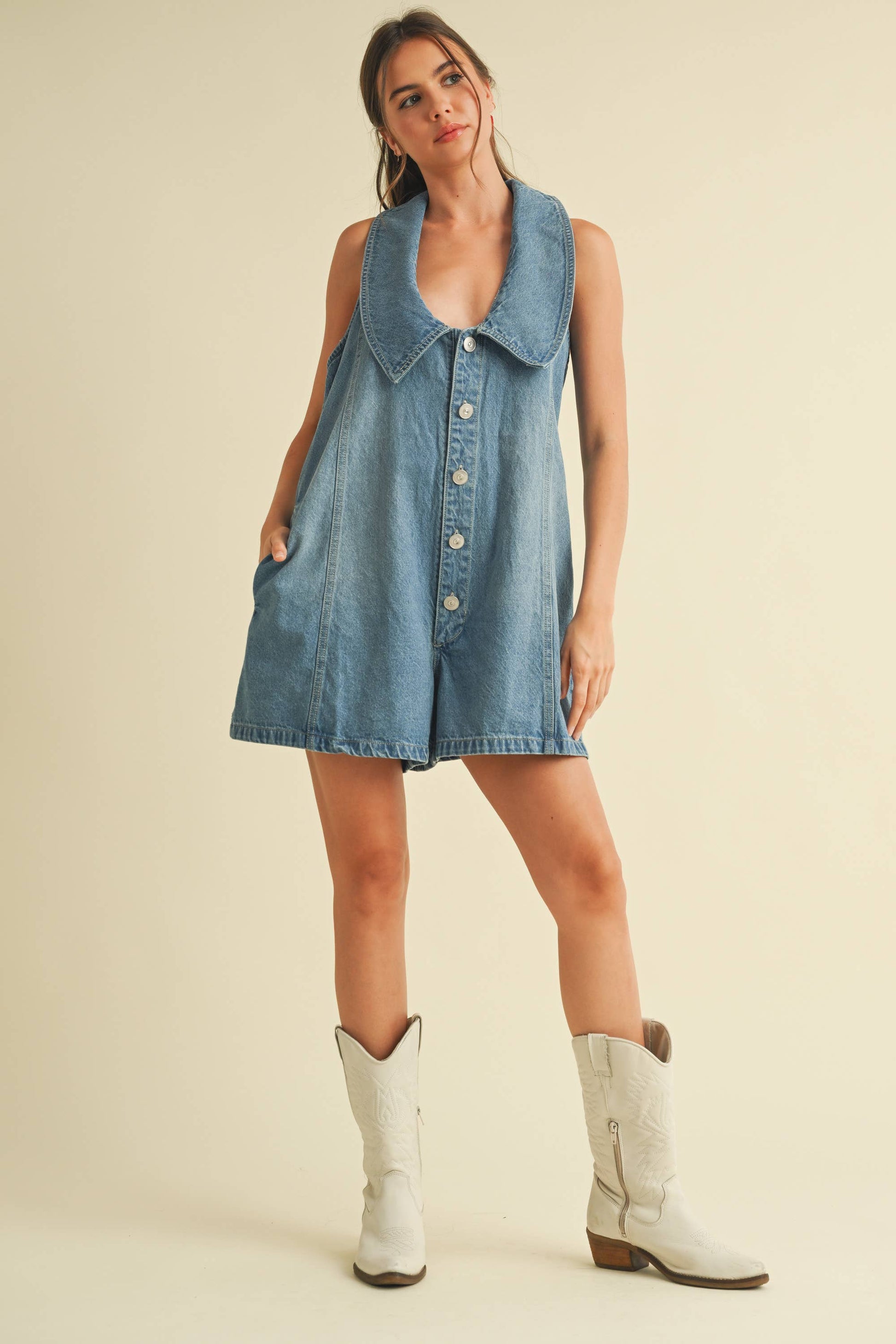 Relax Fit Cotton Denim Button Down Romper with Oversized Collar and Side Pockets