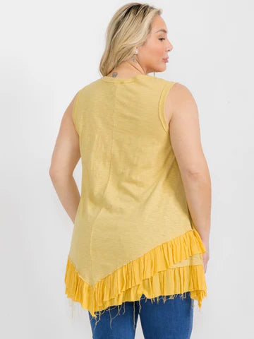 This plus size sleeveless tunic tank top features playful tiered ruffles and a trendy raw edge finish, adding flirty movement and effortless style to your look. Its relaxed fit keeps you comfortable all day, making it perfect for warm days or layering under your favorite jacket. Embrace fun, flowy fashion with this charming piece!