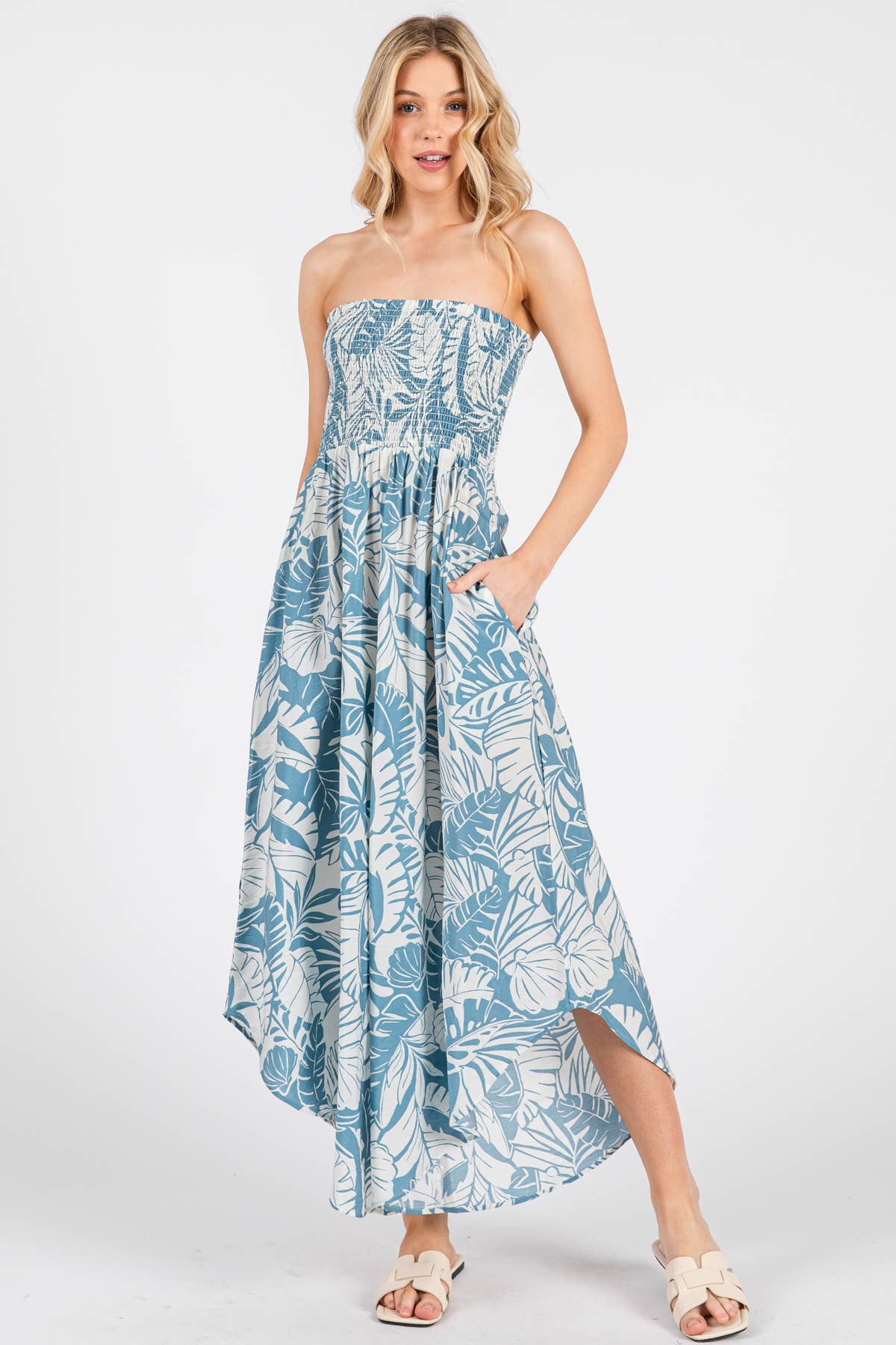 Blue and Cream Flowy Tropic Print Smocked Top Detail Jumpsuit