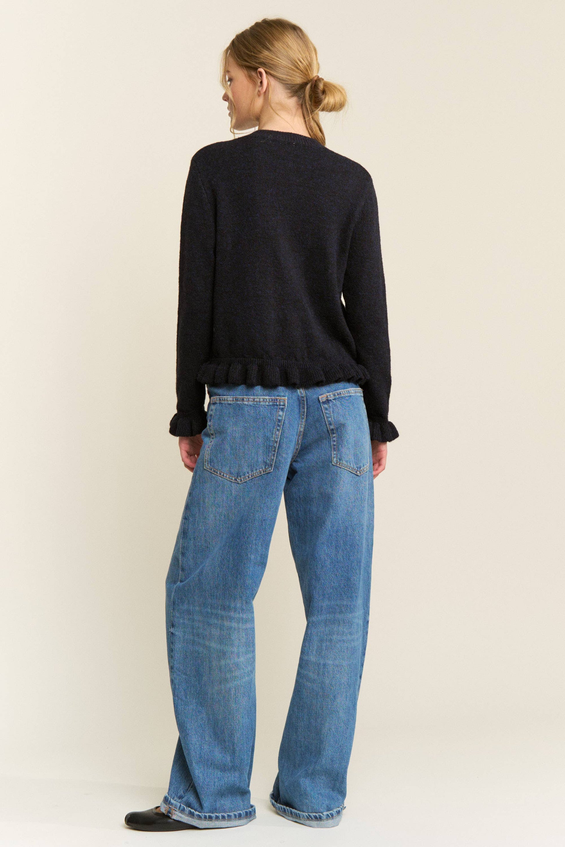Navy Classic Button Cardigan with ruffle cuff and trim. Soft knit fabric with cozy texture - Crew neckline for a classic finish - Full button-up front closure . Long sleeves with a relaxed fit - Cropped length for easy styling.