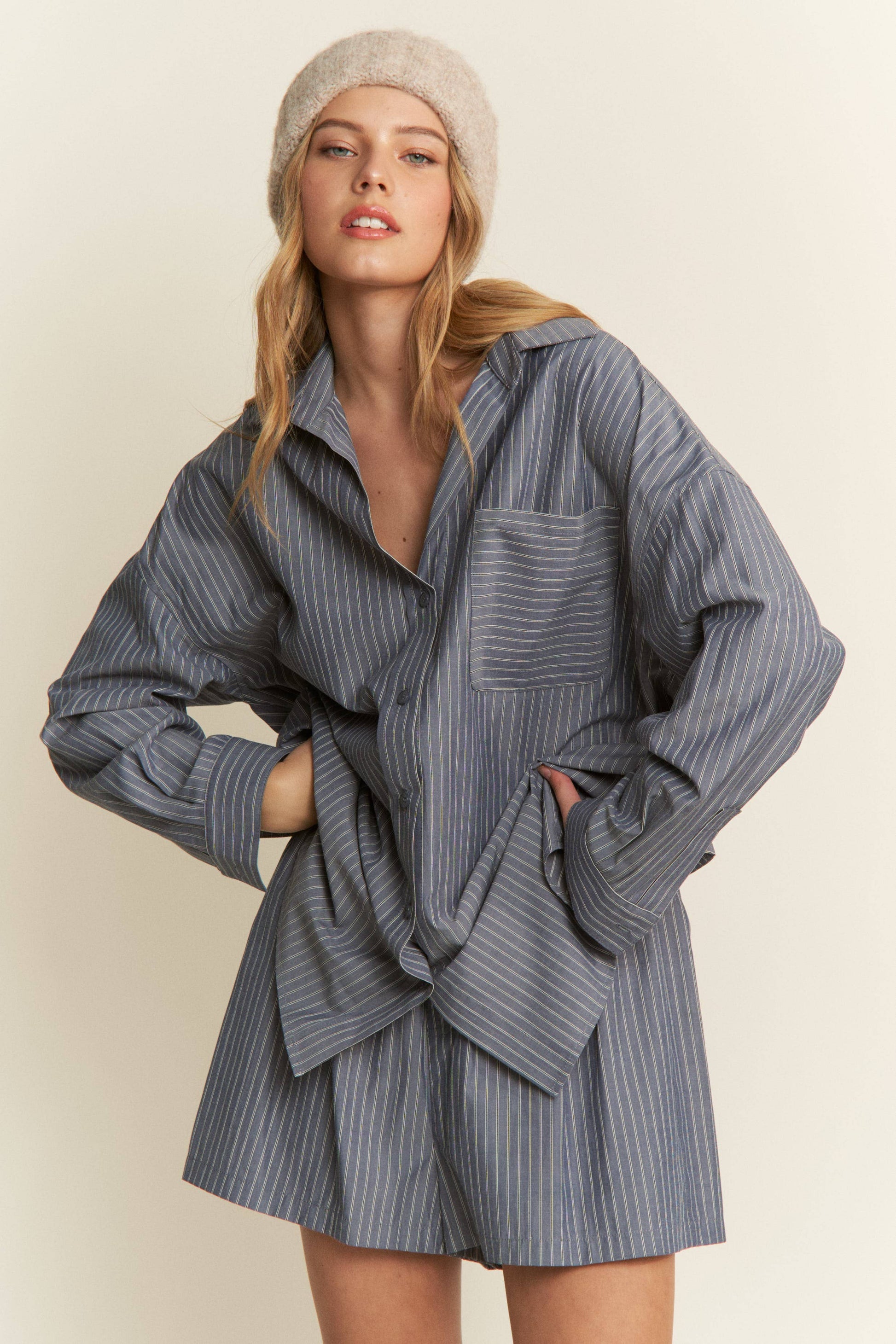 Relaxed comfort meets timeless style with these blue striped cotton lounge shorts. Crafted from soft, breathable cotton, they feature a classic button-front closure and comfortable fit perfect for lounging at home or casual weekend wear. The crisp striped pattern adds visual interest while maintaining an effortlessly laid-back aesthetic. Ideal for pairing with your favorite tee or tank top.