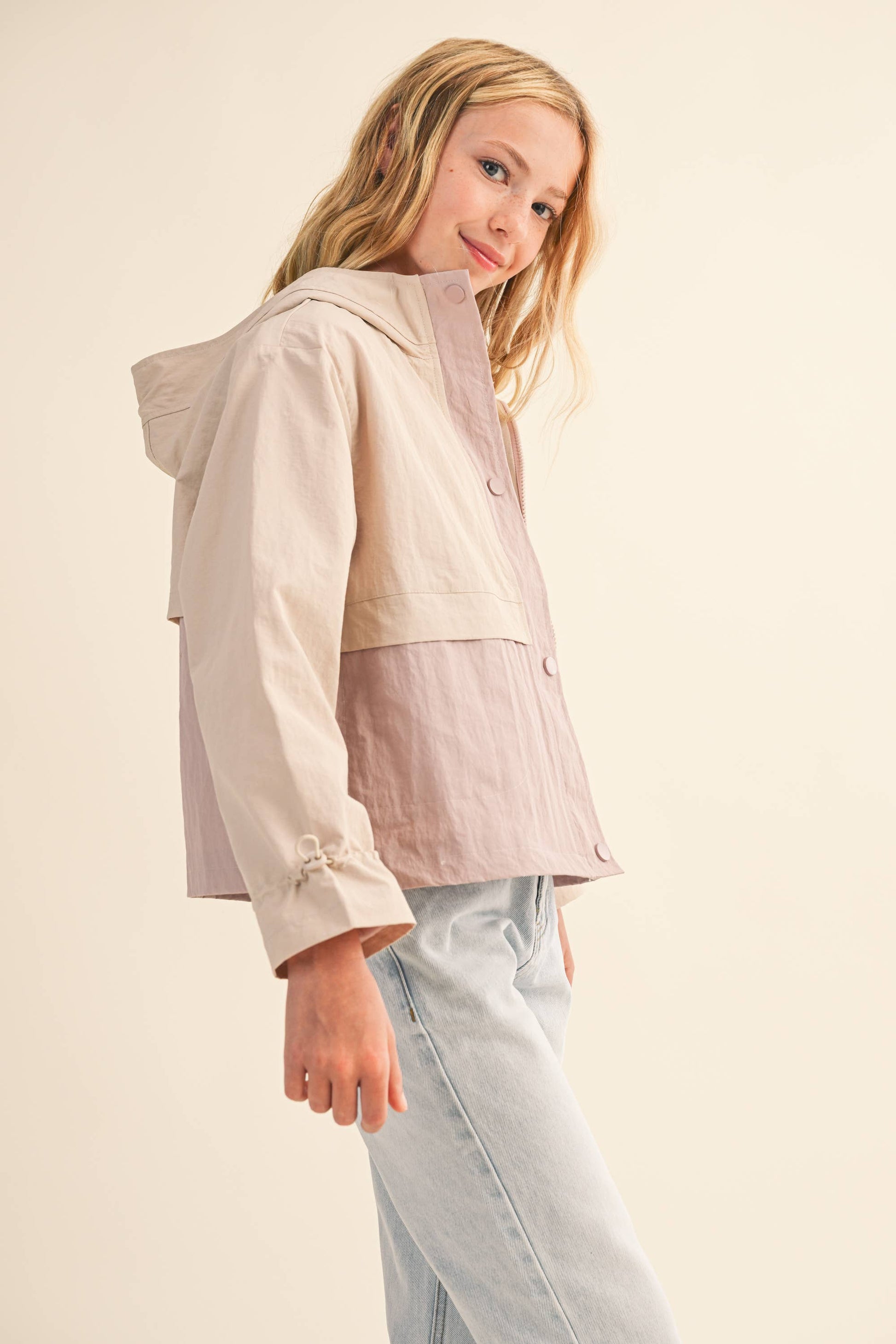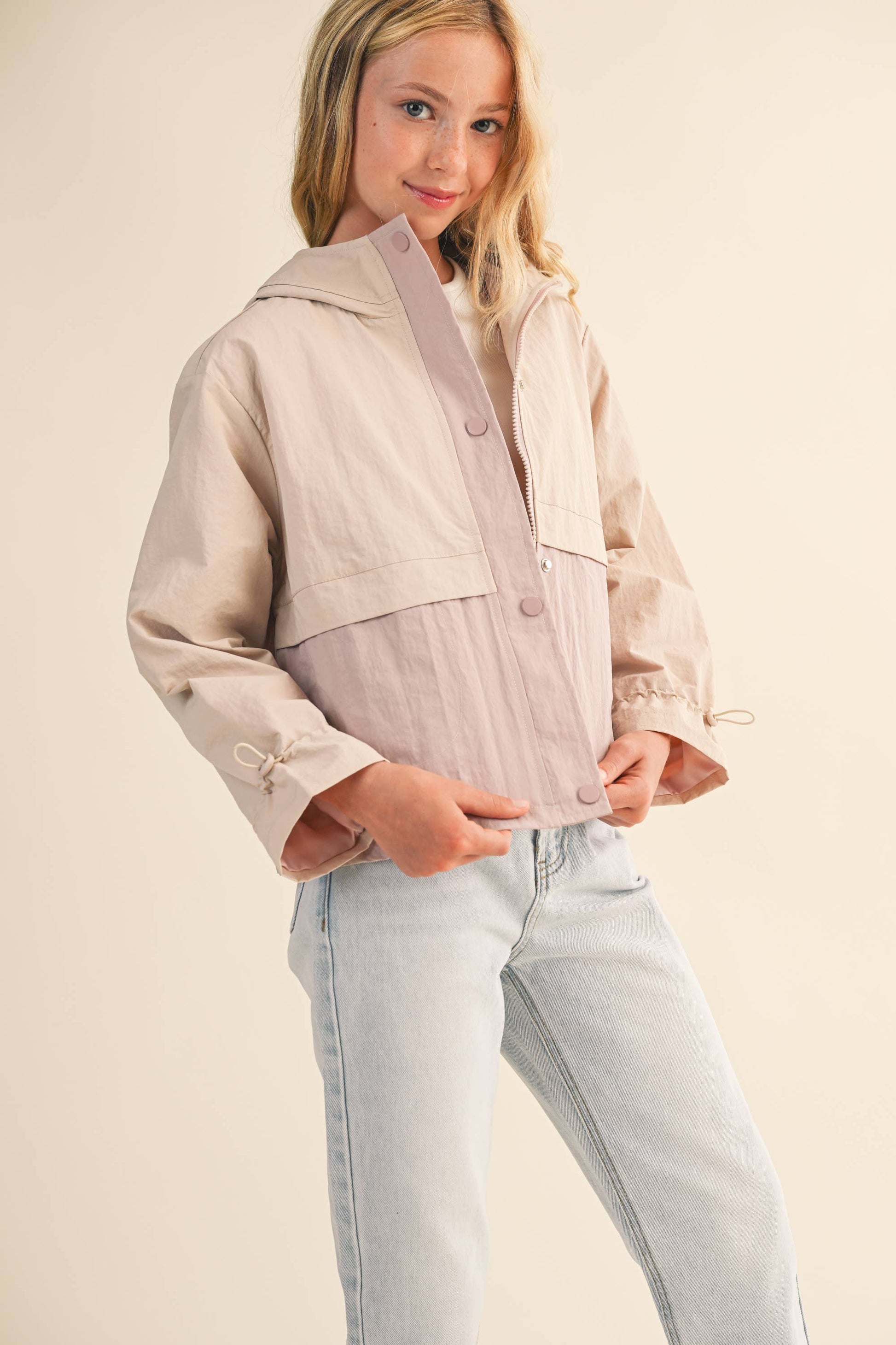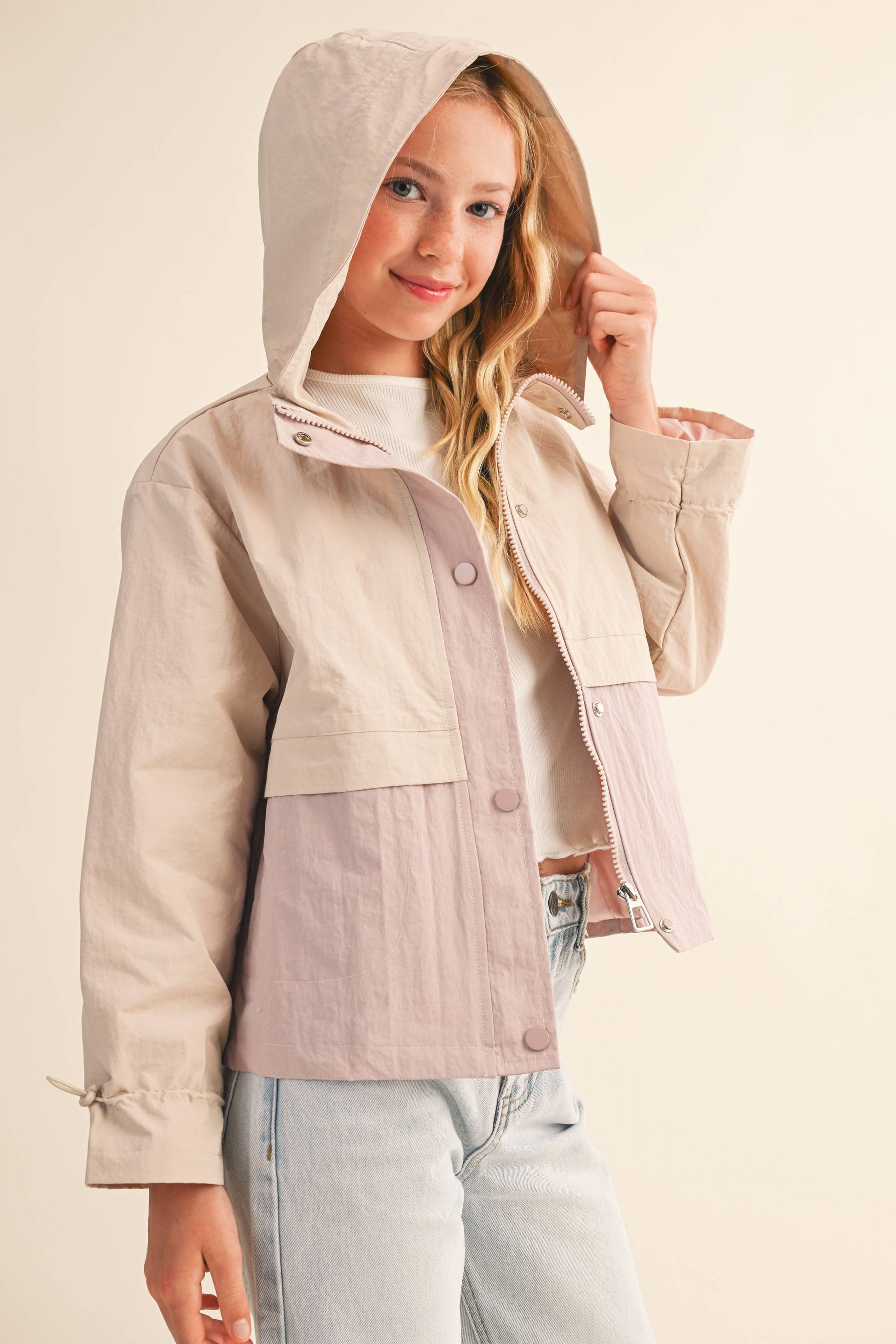 Biege/ Lavender Hooded w/ Cinch Cuffs Windbreaker